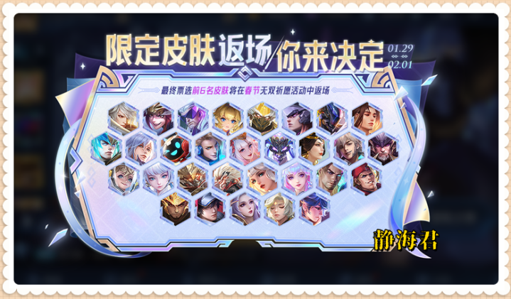 本次限定皮肤返场投票是为了春节期间上线的无双祈愿举行的,规则是前6名进入到无双祈愿的返场池子里,玩家有概率直接抽到(也可以用积分直接兑换)。